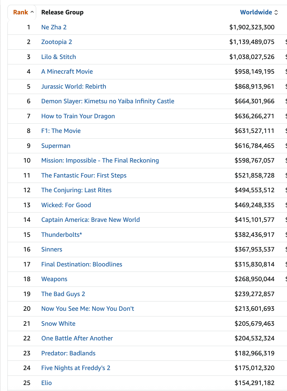 Listen, I know I’m a broken record on this topic but 21 of the top 25 highest-grossing films in 2025 were either sequels or IP spin-offs (I’m counting “F1” as existing IP).