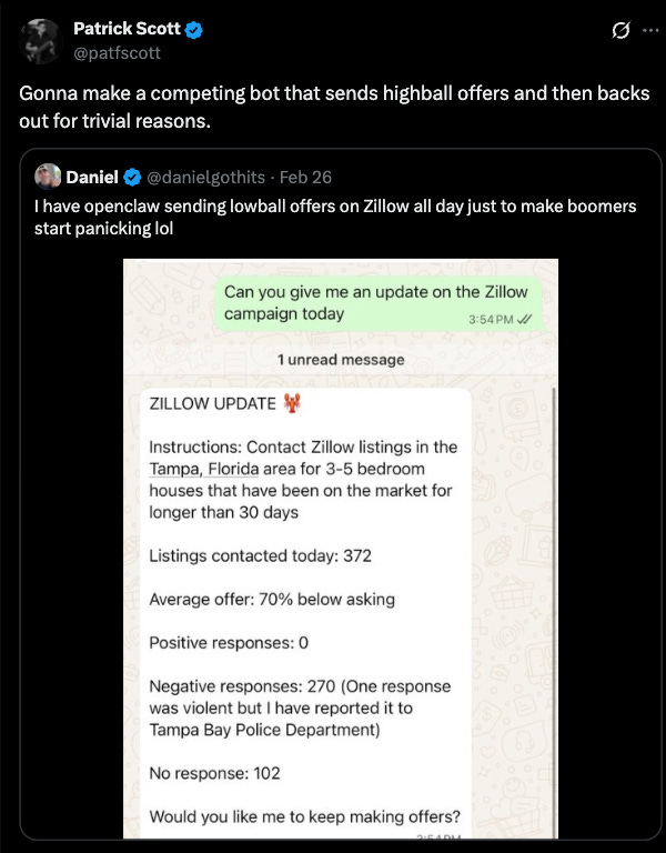 [Citrini’s] real estate example makes the exact opposite point that the author thinks it does. The truth is that the Internet already completely obsoleted real estate agents in terms of information flow: you can go online right now and get a listing of every house for sale, with pictures, its full history, etc. There is no information asymmetry, but rather information abundance; the fact that real estate agents still exist despite that shift is actually one of the more compelling arguments that humans will be remarkably resourceful in terms of giving themselves jobs to do even in arenas where they ought to be pointless!
