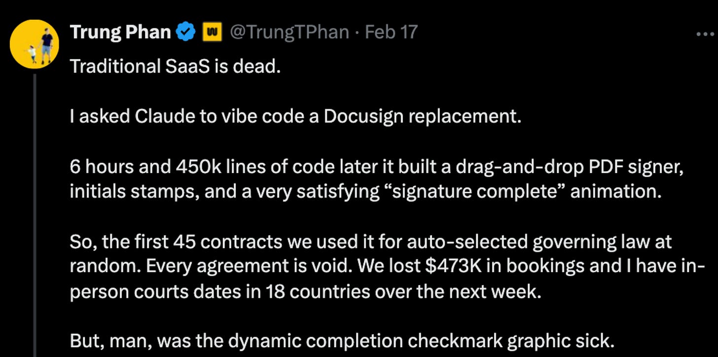 Some Rebuttals: I recently wrote on this topic in “How does Docusign have 7,000 employees?” The code itself is only part of the B2B SaaS value prop. There’s also th built-in workflows, proprietary data, network effects, compliance, customer support and opportunity costs (most firms want to focus on their core competency and are willing to pay for useful 3rd-part software solutions).
