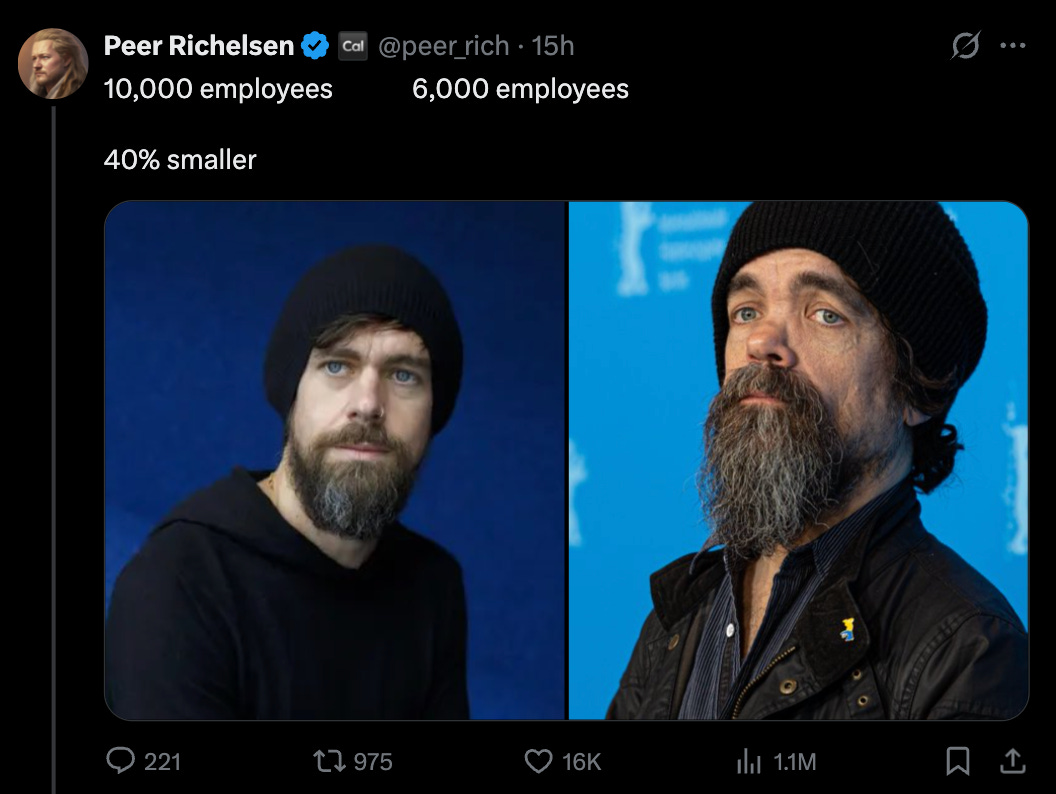 The timeline filled with competing takes on whether it was a proper rightsizing after mismanagement (recall that Dorsey ran Twitter and that company is now 80% smaller in terms of headcount post-Elon). Or if the Block cuts were truly for AI efficiency gains…Dorsey even jumped in on X to clarify the point.
