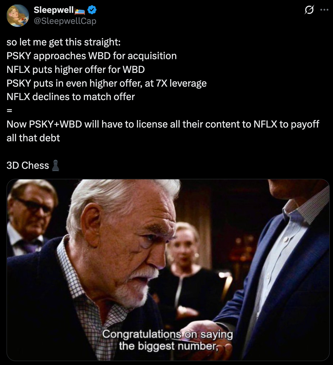 What ensued was a bidding war that saw ~10 bids over 4 months. Most of it was Paramount just pumping the price.