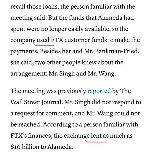 The New York Times spoke with key FTX players include SBF and Alameda CEO Caroline Ellison. They admit to misappropriating FTX user deposits to pay back loans they had taken out to make crypto venture investments.