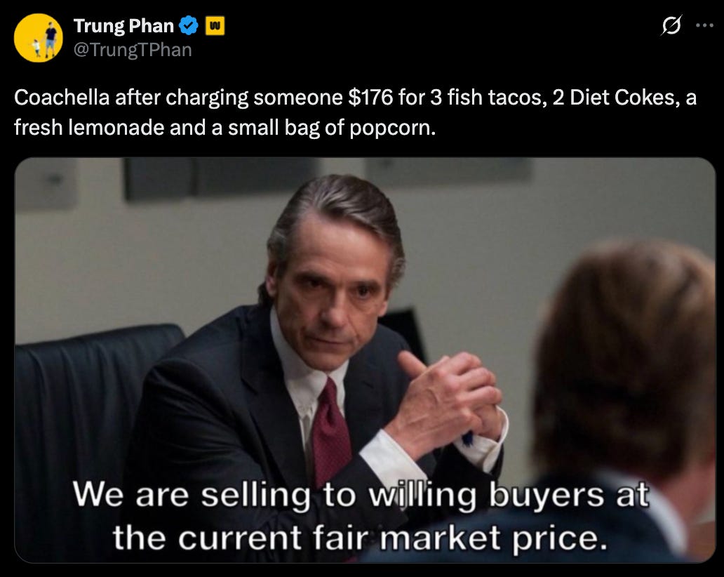 A related stat helps to explain the reaction to concession prices: this year, 60% of the 100,000 people attending the two Coachella weekends paid for their $599 ticket using a payment plan system. Definitely a younger crowd. The entire weekend is $1,000+ per person on average taking in ticket, F&B and merch (which equates to over $100m for Coachella across both weekends).