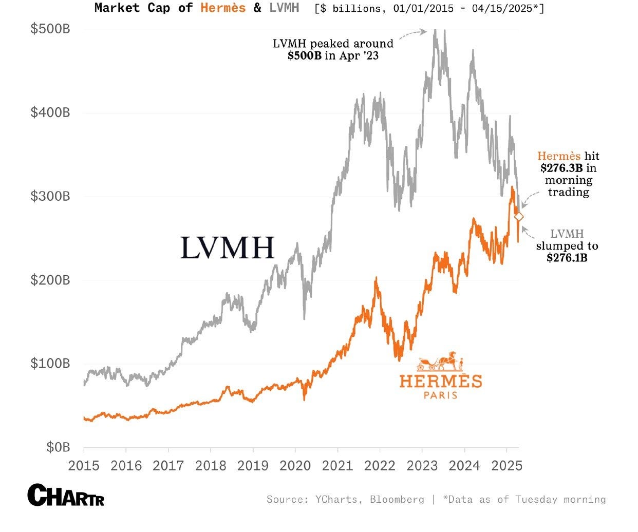 I’ve been sitting on the episode but the recent global trade madness is an opportune time to publish this bad boy. Why? The Hermès position at the top of the luxury world has held steady amidst the threat of tariffs and a looming recession…at least based on the company’s stock performance relative to key competitors.
