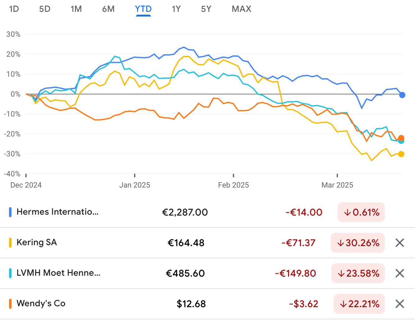 Year-to-date, Hermès is flat while LVMH, Kering and Wendy’s are all down at least 20%+.