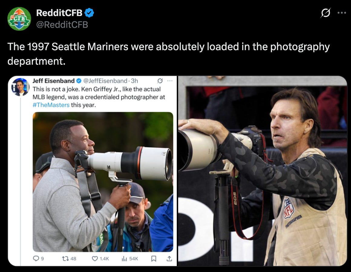 The backstory is awesome: Griffey Jr. picked up photography as a hobby because he wanted to watch his kids play sports without having dozens of people come up to him throughout the game. He started bringing camera equipment and was able to watch uninterrupted. Then, started chatting with his former teammate from the Seattle Mariners, hall-of-fame pitcher Randy Johnson…who is a legit sports photographer now.