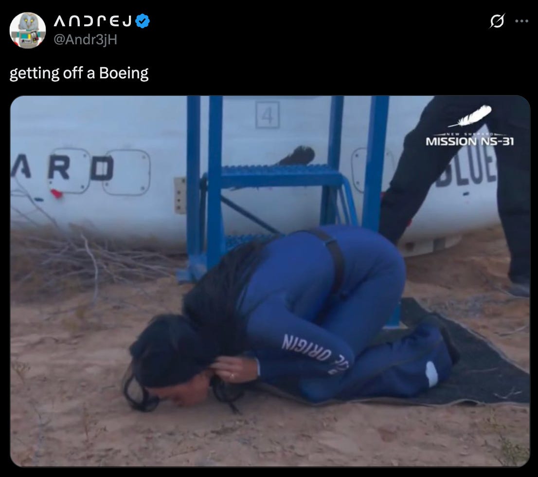 …and them fire posts (including this Katy Perry one; she joined Lauren Sanchez and four other women on the first all-female space flight on a Blue Origin ship…she dropped this pre-flight quote “we are putting the ‘ass’ back in astronaut’” and created a viral image when she returned after the 4-minute space excursion and kissed the ground):