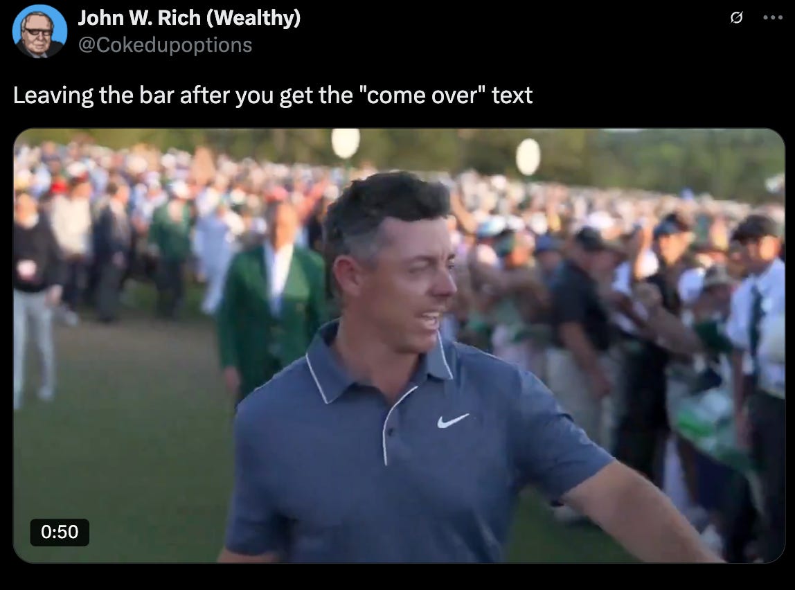 Also, The Masters always delivers on those memes. SHARED VIEWING CULTURAL EXPERIENCE, PEOPLE. That’s the money. The best template that came out of Rory’s incredible Sunday. It’s a 50-second clip (below) of him walking through the crowd after winning and taking it all in. It was clipped by parody account John W. Rich, who told me “I was sitting in the bar watching the coverage and when I saw this clip I ran home and cropped it because I knew it’d run.” There’s some inside meme baseball for you and the template blew up including glorious riffs including for the HR department and the Luka Doncic trade and parenthood (and another clip of Rory seeing The Masters champion locker room for the first time).