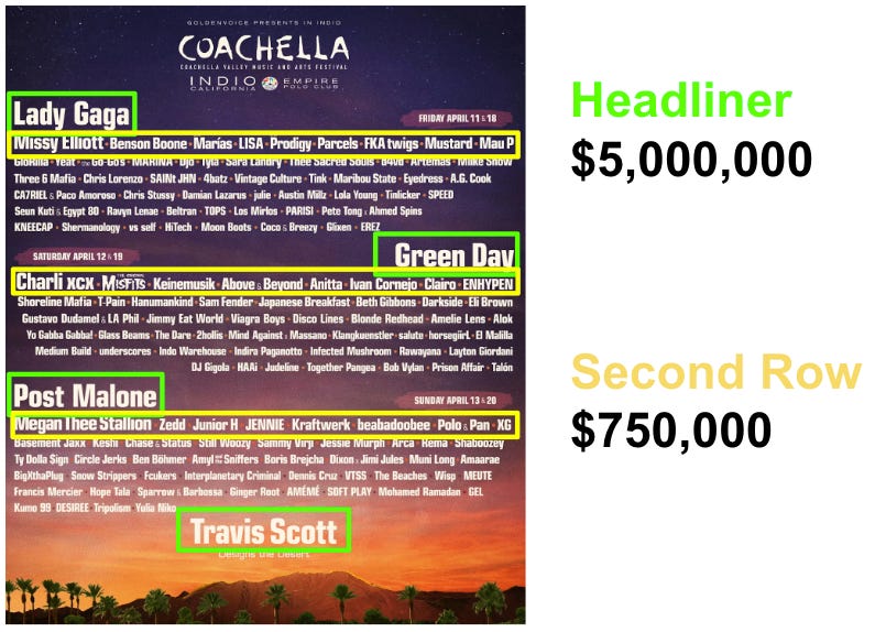 The money is decent and here is a cool heuristic based on the Coachella poster: this year’s headliners are making $5,000,000+ per weekend while artists in the 2nd row typically make $750,000 per weekend.
