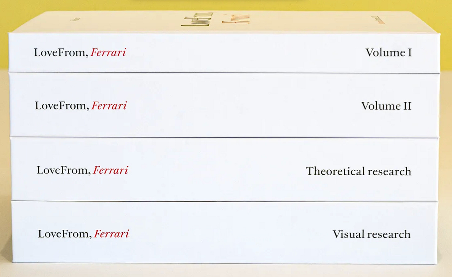 Before LoveFrom drew a single line, they spent six months on research. They presented Ferrari with four books — substantial, rigorous volumes printed in both Italian and English, left page and right page, covering philosophy, design history, the cultural significance of Ferrari within Italy, the relationship between human attention and physical interaction. These weren’t mood boards. They were arguments — about why certain assumptions held, why others didn’t and what first principles should govern the design of a car interior in 2026.