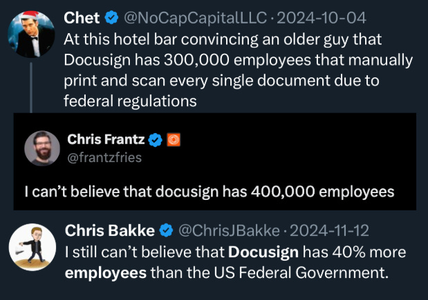 A popular meme in tech social media is, “How does Docusign have [impossibly large number] of employees?”