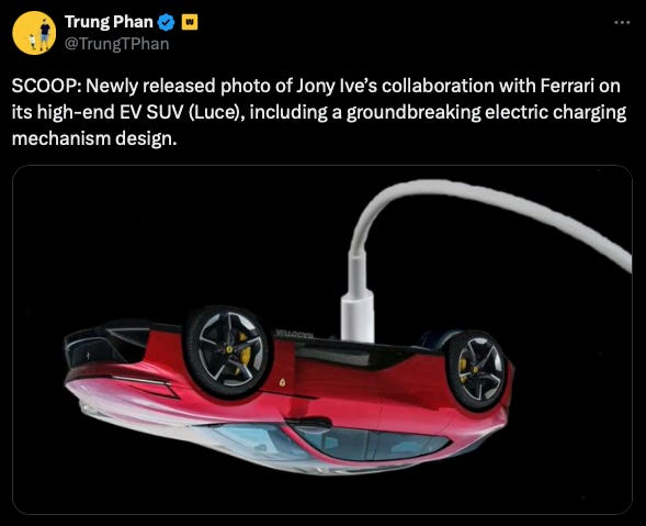 Speaking of Jony Ive, his firm LoveFrom partnered with Ferrari to design the steering wheel, dashboard and interior for the luxury carmaker’s new EV SUV (Luce).
