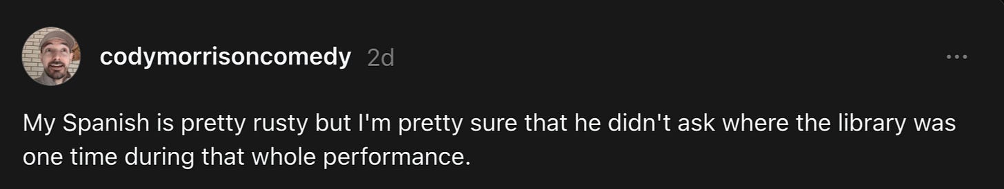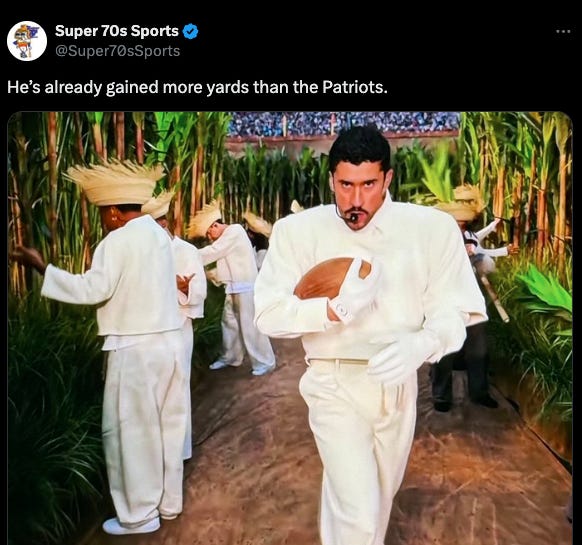 Bad Bunny is super talented and the choreography was ace. Lady Gaga made a cameo. The Latino dance party energy was top-notch, a couple got married live and Jon Hamm was going HAM. Unfortunately, I knew none of the songs or lyrics, and no moment stuck out to me as compared to recent years: Kendrick (“a minor!!!!!”), Usher & L’il Jon (very sweaty), Rihanna (I know literally every lyric), The Weeknd (he sang so much about party drugs that someone made one of the greatest tweets ever: “I know Pepsi sponsors this half-time show, but why is it all about coke?”), West Coast Rap (50 Cent hanging upside down was incredible) and Shakira & JLo (this got a bit PG-13).