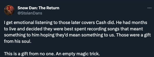 Cash’s “Hurt” is so much greater than any cover that AI can ever make with his voice because we know the stage of his life when he made it. That’s the context.