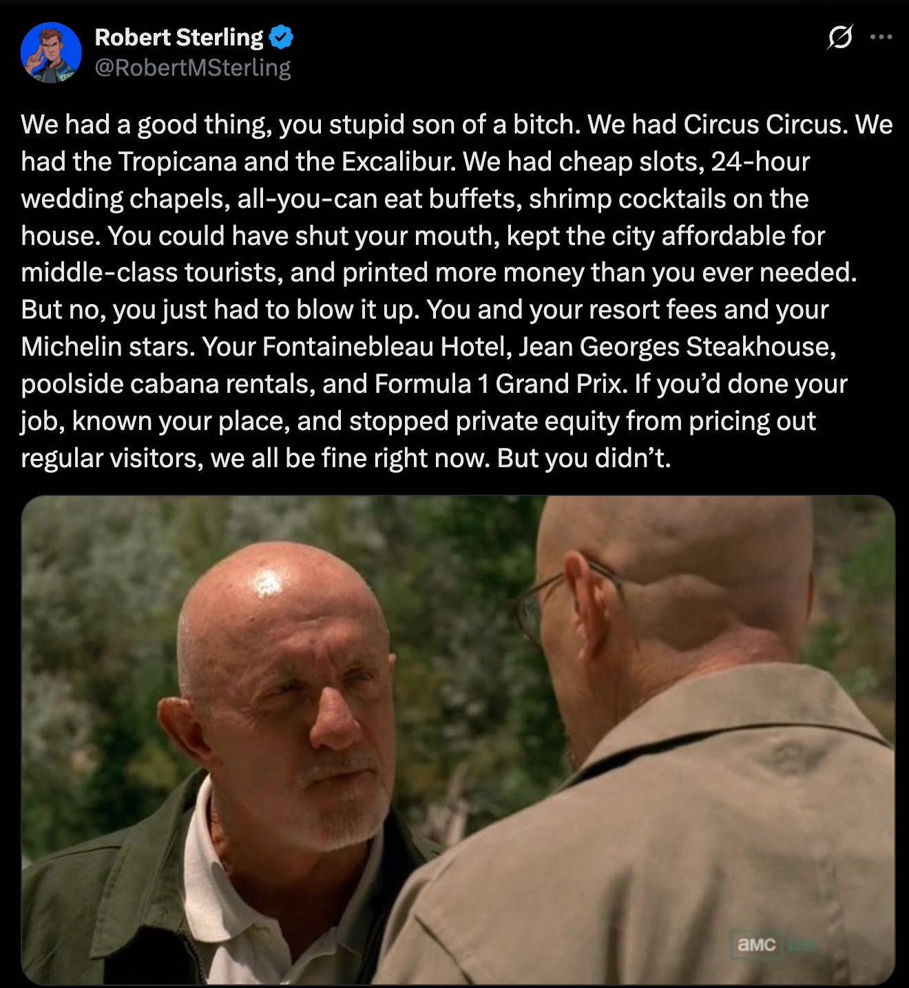 Hotel occupancy has cratered. Rooms were only 66.7 percent full in July, down by 16.8 percent from the previous year. The number of travelers passing through Harry Reid International Airport also declined by 4.5 percent in 2025 during an ongoing ebb of foreign tourists, for familiar reasons. Canadians, historically one of the city’s most reliable sources of degenerates, have effectively vanished. Ticket sales for Air Canada jets flying to Las Vegas have slipped by 33 percent, while the Edmonton-based low-cost carrier Flair has reported a 62 percent drop-off. Dolan said that 10% of visitors to Las Vegas have visited the Sphere, so this is a macro trend to keep an eye one.