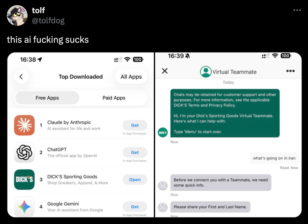 …and here them wild posts (including DICK’S Sporting Goods running an app promotion that shot it to the top of the Top Downloaded Free App charts next to Claude, Gemini and ChatGPT):