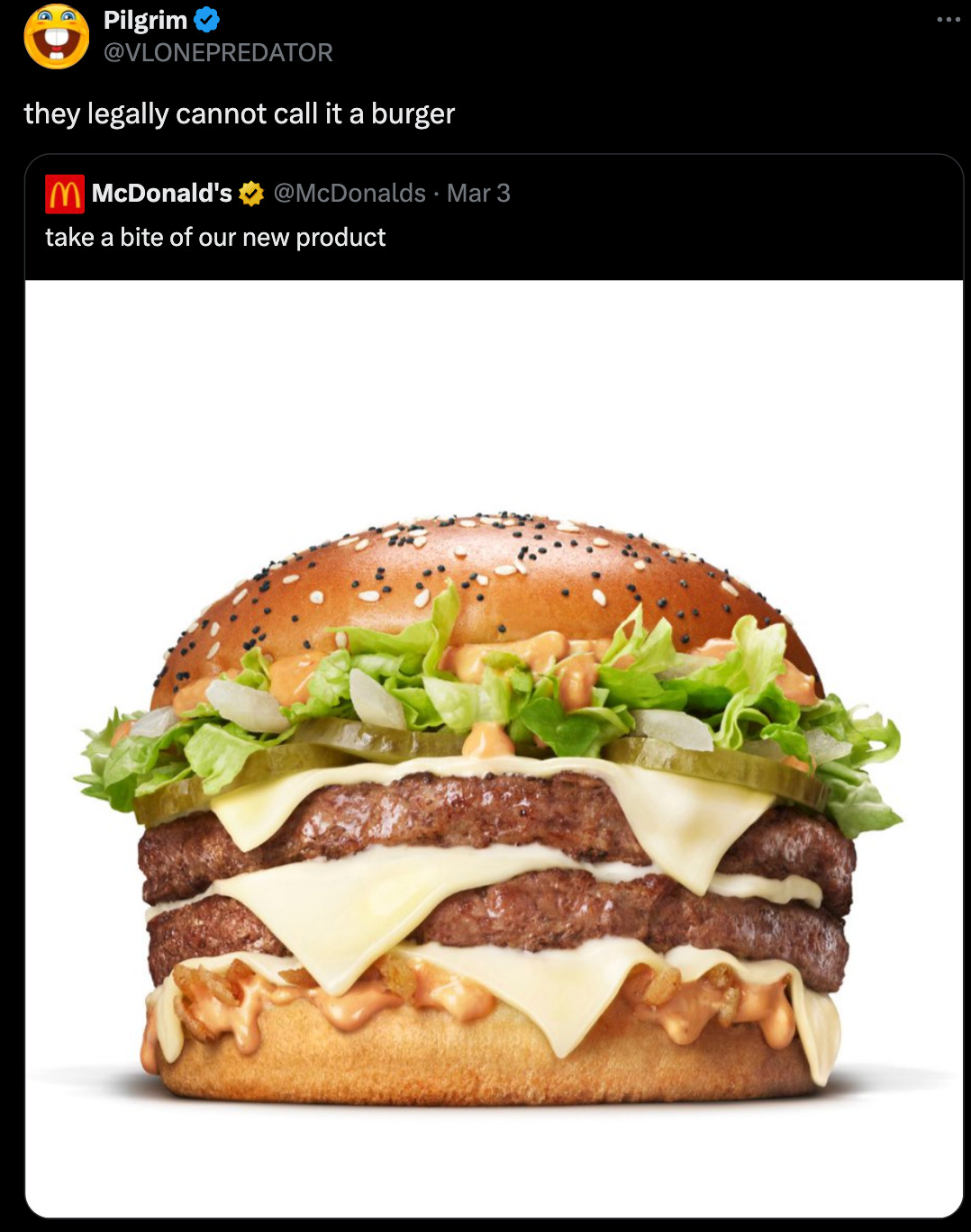 Exclaims that the burger has “patties, sauce, some lettuce — there’s so much going on with this burger”…which is literally table stakes.