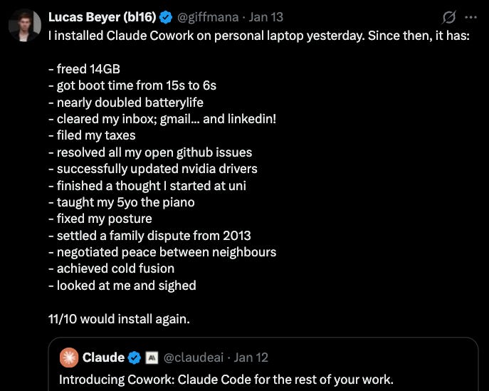 Anthropic launched Claude Cowork, which is a version of their beast Claude Code coding tool…but for normies that just what a natural-language interface. One of their demos was of Claude Cowork cleaning up a user’s desktop, which is impressive but the real move is to just put all the files into a folder saying “JANUARY 2026 CRAP”. Simon Willison has a quick first impressions overview.