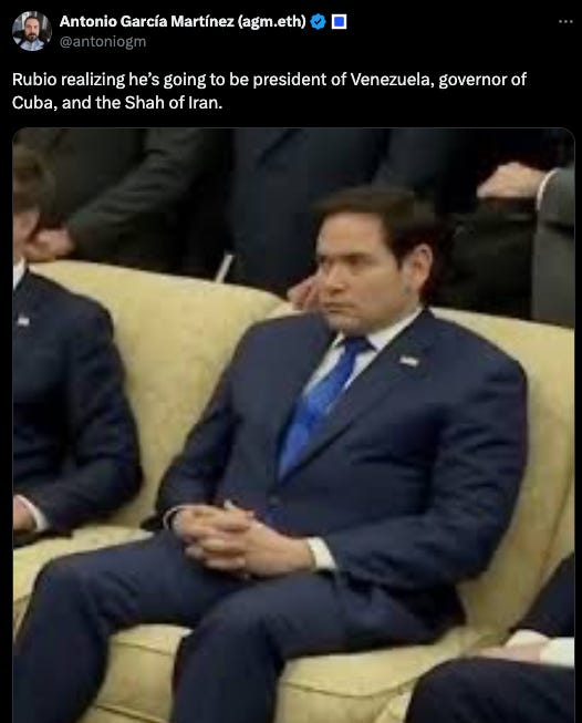 Fast forward to 2026. Rubio is Secretary of State and National Security Advisor. The first person since Henry Kissinger held both roles under President Richard Nixon in the 1970s. In other words, Rubio is wearing a lot of hats right now. And he was given more hats as it looks like Rubio played a pivotal role in recent actions in Venezuela and maybe Cuba, Colombia and [Insert Latin American country].