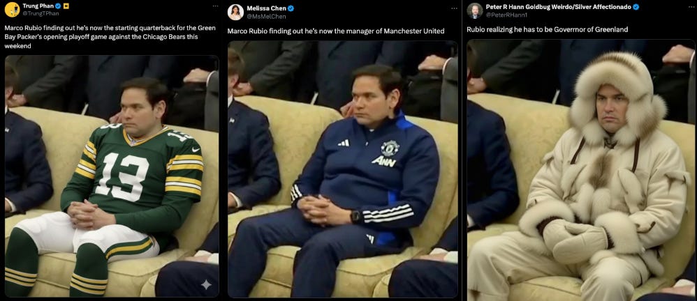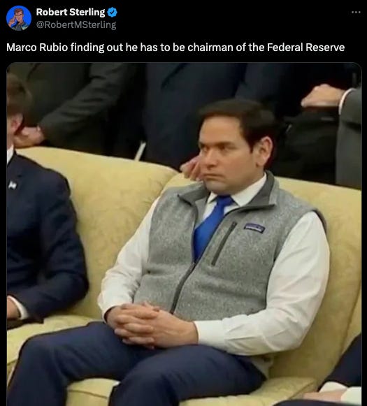 Back to the memes, the quote interactions on Powell’s post (~90m views rn) were absolutely out of control including here, here and here…and it was an ideal setup to bring back Rubio…and I think this format may still have some legs.