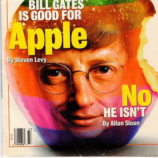Anyways, Microsoft was in a patent lawsuit with Apple because Gates & Co. had ripped off some Apple software (for a video player). Combine that with antitrust pressure from the US government and Gates felt that a healthy Apple would signal “competition” in the market and make Microsoft look like less of a monopoly.